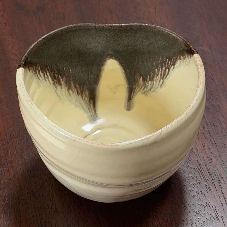 この深目の茶碗は、轆轤成形の後、ハート形(猪目形)に歪ませて仕上げました。土は、私が30年以上寝かせてきた美濃の土を独自に調合したものです。 素焼き後、正面には濃い瀬戸黒釉をたっぷり掛け、さらに内側に私の今古釉を流し入れ、外側の大部分にも回しかけました。釉薬が自然に流れ、内外ともに迫力ある流動景色が生まれています。酸化焼成にて1220度で焼き上げました。