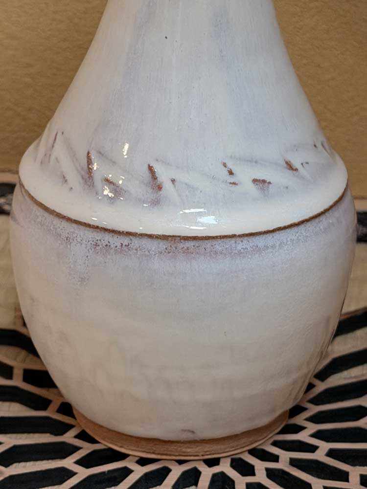 全体に二層の釉薬を施しております。まず透明釉を掛け、その上に今古釉の中でも特に白さを強調した調合を重ね、酸化焼成1210℃で焼き上げました。 椿が最も多く用いられるこの季節にふさわしい花入です。細く長く伸びた首が、椿の蕾や梅の一枝を美しく引き立てます。
