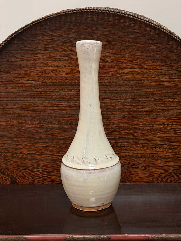 全体に二層の釉薬を施しております。まず透明釉を掛け、その上に今古釉の中でも特に白さを強調した調合を重ね、酸化焼成1210℃で焼き上げました。 椿が最も多く用いられるこの季節にふさわしい花入です。細く長く伸びた首が、椿の蕾や梅の一枝を美しく引き立てます。