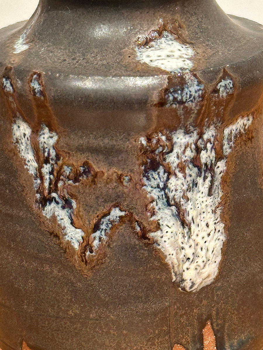 赤土の美濃土を轆轤成形したこの茶入は、ふくらみをもたせた肩の柔らかな姿が特徴です。釉薬は、美濃の伝統的な瀬戸黒釉を基調に、九州で得た調合の無農薬餅米の藁灰釉を無作為に掛け流し、その二種が溶け合うことで自由奔放な景色が現れました。この釉薬の組み合わせは私独自のもので黒白釉と称しています。窯変や景色は意図によるものではなく、見る方それぞれの想像に委ねています。